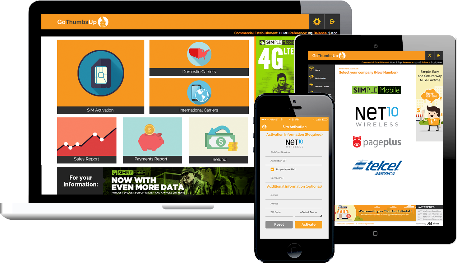 GoThumbsUp es nuestra plataforma todo-en-uno (PDV web) que te permite vender activaciones de tarjetas SIM, y recargas nacional e internacional de tiempo aire para celulares prepago, de un modo fácil y seguro.